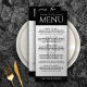 Adicione sofisticação às comemorações do aniversário do casamento em 11 siderúrgico com este menu janto, que contém elegantes inscrições em placas de diamante, aço vestido e fundo preto. Personalize com nomes de casal, datas de casamento, detalhes do local, itens de menu e mensagens de parabéns. Design © W.H. Sim. Mais informações em zazzle.com/expressionsoccasions