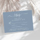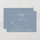Cartão RSVP de casamento azul empoeirado com "rsvp" em um roteiro branco-na moda com traços, tipografia branca simples e elegante, opções personalizadas de entrada de menu e seus nomes unidos por um coração no verso.