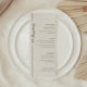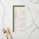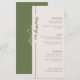 Um cardápio simples e moderno de cinzas e de bodes verdes, com letra simples e escrita, e um elemento floral no verso. Personalize com seus itens de cardápio de casamento, e seus nomes e data de casamento na parte inferior do cartão.