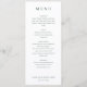 Este design de menu elegante apresenta um layout vertical limpo com foco em simplicidade e sofisticação. O texto preto é definido contra um fundo branco, criando uma aparência de alto contraste e fácil leitura. Fontes serifadas são usadas em todo o design, adicionando um toque clássico ao estilo geral. Perfeito para eventos formais como casamentos ou reuniões sofisticadas, este design enfatiza clareza e refinamento, tornando-o ideal para apresentar uma seleção cuidadosamente elaborada de pratos.