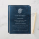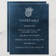 Design de casamento elegante e elegante. Papel de cor d'água azul marinho. Linda concha com flores. Letra branca. Combinação de fontes elegante. Monograma de casamento: coroa de louros clássicos com as iniciais da noiva e do noivo. Perfeito para casamento na praia, casamento à beira-mar, casamento costeiro ou casamento no oceano. Tema de cor azul e branca, design elegante simples faz dele uma escolha excelente para um casamento semiformal clássico.