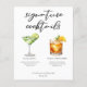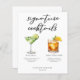 Esta lista de coquetéis de assinatura de bar de casamento apresenta uma simples tipografia negra acima de 2 das suas bebidas favoritas e seus ingredientes para sua recepção. Uma Margarita Chic e um desenho Dark and Stormy adicionam um talento divertido ao seu menu de bar. Preencha com os nomes dos casais e a data para sua recepção.
