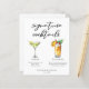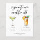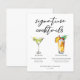 Esta folha de papel de cardápio de coquetéis de assinatura gráfica apresenta uma típica tipografia negra acima de 2 bebidas e seus ingredientes para seu bar de casamento. Um belo desenho de Martini e Piña Colada adiciona um talento legal ao seu menu de bar. Preencha com os nomes dos casais e a data para sua recepção.