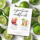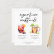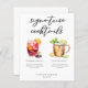 Esta lista de coquetéis de assinaturas chic apresenta uma simples tipografia negra acima de 2 bebidas e seus ingredientes para seu bar de casamento. Um belo desenho de Sangria de verão e mula de Moscou adiciona um talento legal ao seu cardápio de bar. Preencha com os nomes dos casais e a data para sua recepção.