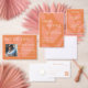 Ponha o tom para sua refeição de casamento com menus mostrando seus pratos em itálico elegante sob títulos simples de serifa. Um arranjo semelhante a colagem de formas de abstrato flutua no fundo criando uma estética contemporânea. Personalize-o com seus próprios detalhes. Para mais personalização (cor de fundo, estilo de fonte e cor), clique no link "Personalizar" e use nossa ferramenta design para modificar esse modelo.