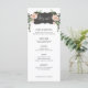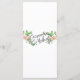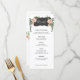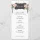 Este menu de deserto floresce apresenta flores cor-de-rosa e verde em ambos os lados de uma caixa preta curva com a palavra "Vamos Eat". Há espaço para 5 cursos. Todos os detalhes do menu podem ser editados. As cores incluem verde, rosa, branco e preto. O nome da noiva e do noivo aparece no verso.
