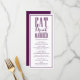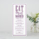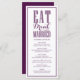 Coma, beba e se case. Preencha sua capa de mesa de eventos com este cartão de menu personalizável. Apresenta caligrafia moderna e tipografia clássica, perfeita para qualquer tema de casamento. Personalize adicionando seus detalhes. Itens correspondentes estão disponíveis. Esta placa de menu roxa está disponível em outras cores.
