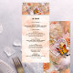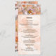 O cardápio do casamento com uma bela design com uma borboleta laranja tocando miçangas de pérolas brancas em forma de coração. Outra borboleta se mistura no buquê das rosas laranja-claro e rosa. Laranja é a cor do tema na imagem do papel pergaminho. Converta isso para qualquer ocasião. Adicione uma foto e/ou altere o texto. Personalize isso com suas informações.