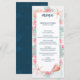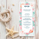 O menu de casamento do tema "Embaixo do Mar", náutico, apresenta um recife de coral de cor aquosa e conchas, em tons de aqua, horta, coral e rosa, com marinho de letra azul. O lado inverso é um padrão de conchas e corais em um fundo azul marinho. Coordena-se com a minha coleção "Recife Tropical" e é perfeita para temas de casamento de praia, náutica, costeira e destino. Estoque da KL original