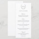 Menu de casamento tradicional e clássico preto e branco com uma crista de casamento com seu monograma dentro de uma coroa juntamente com os títulos em uma escrita / caligrafia. Estes menus de casamento simples, porém elegantes são ótimos para um casamento formal.