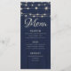Apresentando nosso cardápio de casamento rústico cativante com luzes de cordas brilhantes contra um fundo de efeito de madeira marinho escura. Perfeito para a celebração do tema do celeiro rústico. Personalizar com facilidade