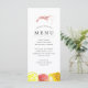 Menus personalizados de comida temática de camarão para sua próxima Festa de Cozido de Camarão ou evento de frutos do mar. Apresenta uma ilustração estilizada em aquarela de um camarão. Debaixo disso há espaços para as informações do menu do seu evento único.