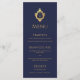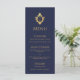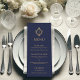 Um cardápio elegante com um ar vintage, recomendado para um casamento com cores de casamento azul-marinho e dourado.