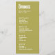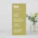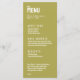 Apresentando o Cartão do Menu Rustic Harmony Wedding, um complemento refinado e encantador para a sua comemoração temerária. A frente do cartão de menu apresenta um pano de fundo verde-oliva cativante, definindo o tom para uma estética suja e elegante. O design, focado na simplicidade, oferece uma canvas limpa para detalhes essenciais do menu de casamento. Na parte inferior da frente, um espaço pensativo é reservado para o casal adicionar texto pessoal, seja uma nota sincera, uma mensagem especial, ou até um toque lúdico. Esta área personalizável permite que você faça o menu exclusivamente seu, adicionando um elemento pessoal e íntimo à sua papelaria de casamento. A viragem do cartão para o fundo revela o Menu Bebidas, mantendo o belo esquema de cor verde-azeitona. Esta seção apresenta uma lista abrangente de opções, incluindo coquetéis, bebidas espirituosas, vinhos e cervejas, atendendo a preferências diversas e melhorando a experiência geral de bebidas para seus convidados. A na moda e a design prática se integra perfeitamente à estética da Rústica Coleção de Harmonia, criando uma atmosfera coesa que reflete o amor e a alegria celebrados no dia do seu casamento. O fundo verde-oliva de ambos os lados proporciona um pano de fundo harmonioso para os pormenores dos menus e toques pessoais. O Cartão de Menu Rustic Harmony Wedding, com seu design requintado, recursos personalizáveis e opções abrangentes de bebidas, serve não apenas como um guia funcional, mas também como uma merecedora atenção. Engloba a beleza e o amor celebradas no seu dia memorável de uma forma rústica e elegantemente verde-oliva.