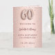 Um fundo gradiente em rosa dourado falso com diamantes rosa. O nome é escrito com uma fonte moderna de letra manual em cor rosa dourado escuro. O número 60 é escrito com uma fonte estilo balão, em itálico. Texto de boas-vindas, foto, cardápio e um agradecimento no verso.