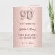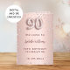 Um fundo gradiente em rosa dourado falso com diamantes rosa. O nome é escrito com uma fonte moderna de letra manual colorida em rosa dourado escuro. O número 90 é escrito com uma fonte estilo balão, cursiva. Texto de boas-vindas, foto, cardápio e uma nota de agradecimento no verso.