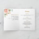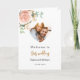 Texto de boas-vindas, foto, programa, menu e uma nota de agradecimento no verso. Decorado com rosa dourado, rosas e eucalipto verde. Talvez seja necessário ajustar o texto do menu e os nomes no verso, dependendo do texto necessário.