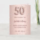 Um fundo de gradiente rosa dourado falso com diamantes rosa. O nome é escrito com um moderno e escuro, rosa dourado, escrito com letra de estilo manuscrito. O número 50 é escrito com uma fonte de estilo balão, script. Texto de boas-vindas, foto, menu e uma nota de agradecimento no verso. Talvez seja necessário ajustar o texto do menu e o nome no verso, dependendo do texto necessário. Você também pode remover a foto no dentro e adicionar um programa se quiser.