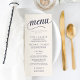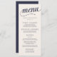 Coloque estas placas de menu elegantes em cada lugar para obter um toque bonito na configuração do evento. O Chic design apresenta um cabeçalho de caligrafia moderno em um fundo de marfim de creme suave com profunda inscrição azul marinho à meia-noite. Use os campos modelo para adicionar as informações do menu e clique em "Personalizar" para reposicionar os elementos, se necessário. Precisa de ajuda? Entre em contato comigo através do link "Perguntar a este Designer" nesta página.