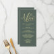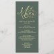 Este menu elegante apresenta tipografia de ouro galopante e florescente sobre um fundo verde sábio. Você pode adicionar seus detalhes no menu personalizar. Este menu faz parte de uma bela suite de casamento que pode ser totalmente personalizada.