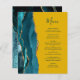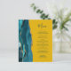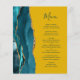 A borda esquerda deste elegante cardápio moderno de casamento apresenta uma coloração aquosa azul-lacrimogênea, aparada com uma falso brilho dourado. O texto personalizável combina o script de escrita manual de letras escuras e as fontes de impressão em um fundo amarelo de mostarda de tendência. O verso apresenta um design de chaleira e de agata dourada.