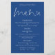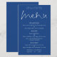 Menu de Casamento Azul Branco do Script Na moda de Orçamento. Um tamanho de preço orçamentário de 5,5" x 8,5",Um design tipográfico elegante em azul de médio com tipografia branca e um script na moda para o Menu de cabeçalho. Personalize facilmente o resto do texto para seus próprios detalhes, o que inclui espaço para suas opções vegetarianas ou vegetarianas. Você também pode alterar estilos e cores de texto, bem como as cores de fundo, por meio da opção personalizar mais, se desejar.