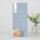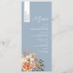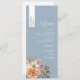 Elevem sua recepção com este menu personalizado de casamento, com elegante fundo azul empoeirado, florais de cor aquosa de pêssego mole e um nome de convidado impresso em uma faixa vertical — perfeito para combinar um menu com um cartão de lugar. Ideal para primavera, verão, vassoura ou casamentos rústicos, este menu personalizado traz um toque polido e coordenado às suas configurações de mesa. Combina lindamente com o cheio Dusty Blue e Peach Floral Wedding Suite.