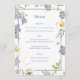 Summer Flowers Blue Wedding Menu desenhado com flores petitas em tons macios de azul e branco, com amarelo. O texto do lado frontal inclui: Menu, Apetista, Entre e Seleções do Deserto. O texto inverso inclui: Os primeiros nomes e a data de casamento da noiva e do noivo sobre fundo azul suave. Para personalizar, basta inserir os Detalhes do Menu Casamento no nosso modelo fácil, substituindo o texto de exemplo. Certifique-se de ver toda a Coleção de Casamentos Azuis das Flores de Verão para cartões e acessórios correspondentes.