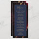 Este elegante e moderno menu de casamento mostra uma cor-d-água, borrifada, de fundo, aparada com brilho dourado. O texto aparece em letras elegantes douradas e fontes em cores em um retângulo azul marinho. O design de ágata é repetido no reverso.