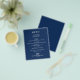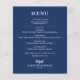 Um documento de valor de barato de 80 lb. de peso, essas pequenas placas de menu de janto azuis de marinho apresentam suas opções de comida em letras brancas quentes. Perfeito para uma recepção de casamento moderna, janto de ensaio de casamento, festa de aniversário, ou qualquer evento especial com um janto sentado. *Medidas de 4,5" x 5,6" (ou escolha entre 2 outros tamanhos) O Serviço de Design ao Vivo pode ajudá-lo com o layout, o tamanho ou o ajuste da cor, se necessário.