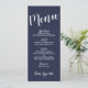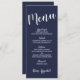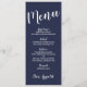 Marinho Náutico de Script Moderno Cartão de Menu Azul de Casamento com título na letra branca do script moderno com detalhes do menu de casamento na fonte branca do sans moderno em fundo azul marinho.