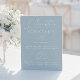 Apresentando uma sofisticada combinação de azul suave poeirento e branco nítido, este menu mostra lindamente suas bebidas de assinatura curadas em um design chic moderno. Perfeito para um tema de casamento na moda e coeso, ele serve como um guia funcional para seus hóspedes e como uma peça de decoração na moda. Como parte da coleção de casamento "Genna", ela se junta facilmente a outros itens correspondentes para criar um tema coeso e sofisticado. Visualize o link de coleção nesta página para ver todos os itens correspondentes nesta bela design.