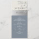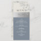 Adicione um toque de elegância ao seu casamento no inverno com este maravilhoso menu de casamento boho-chic. Apresentando um belo pano de fundo azul empoeirado, flores douradas e sotaques prateados, ele combina perfeitamente elementos modernos e antigos para um aspecto sofisticado e romântico. Ideal para uma celebração de inverno, este menu traz um toque único e refinado para o seu dia especial.