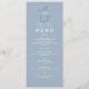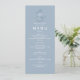 Um menu de casamento simples, contemporâneo, azul empoeirado, com caligrafia moderna e uma moda elegante.