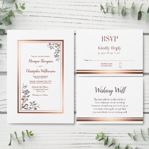 Um elegante menu de casamento branco embelezado por ouro rosa/cobre.