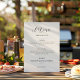 Adicione um toque de elegância moderna ao seu casamento com o nosso modelo de cardápio preto-e-branco. Seu design limpo e minimalista destaca seu menu personalizado — com iniciações, redes, sobremesas — em um formato chic, fácil de ler. Ideal para qualquer estética de casamento, esta modelo versátil é perfeita para as configurações de bufê ou chapéu.