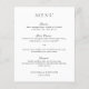 Menu de casamento preto e branco dentro do orçamento (impresso em papel fino de folheto) com um design simples e minimalista, com o título em uma fonte serifada tradicional e os cabeçalhos dos pratos em uma elegante caligrafia. Um estilo clássico perfeito para um casamento formal.