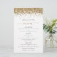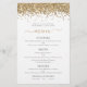 Menu de Casamento de Script Dourado de Literatura do Orçamento Elegante. Um tamanho de preço orçamentário de 5,5" x 8,5", um script de na moda com alternâncias para o menu de cabeçalho e uma borda falsa com brilho no topo de ambos os lados em ouro. Personalize facilmente o resto do texto para seus próprios detalhes, o que inclui alternativos para suas opções vegetarianas ou vegetarianas.