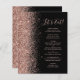 A borda esquerda deste elegante cardápio moderno de casamento apresenta uma rosa dourada falso borda brilhante. O título personalizável e o texto combinam o script de escrita manual branco-rosa cor-de-rosa e as fontes em um plano de fundo preto. O verso apresenta um design brilhante rosa e preto correspondente.