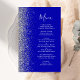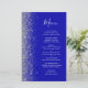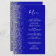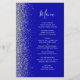 A borda esquerda deste elegante menu de casamento moderno apresenta uma borda cintilante de prata. O texto personalizável combina o script branco de escrita manual e as fontes de impressão em um fundo azul real. O verso apresenta um design brilhante real e prateado.
