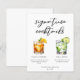 Esta elegante folha de menus de coquetéis de assinaturas da noite apresenta uma simples tipografia negra acima de 2 das suas bebidas favoritas e seus ingredientes para o seu bar de casamento em escala. Um desenho chic Dark & Stormy e Gin e Tonic adiciona um talento divertido ao menu do seu bar. Preencha com os nomes dos casais e a data para sua recepção.