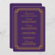 Estes cartões de menu apresentam uma paleta de cor roxa e dourada, um quadro geométrico e outros detalhes estilísticos inspirados na Arte Deco e nos vinte e poucos anos ruidosos. Você pode personalizar os campos de texto de exemplo de acordo com o seu gosto.