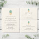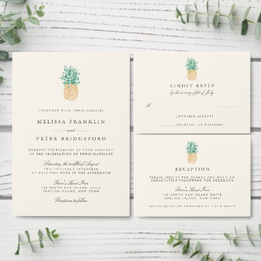Projetados para coordenar com a nossa coleção de casamento Vintage Pineapple, estes cartões de menu apresentam carateres cardíacos profundos e uma ilustração de abacaxi com estilo vintage em verde tropical e ouro amarelo num fundo branco quente, com amplo espaço para vários cursos de comida, bem como os nomes dos casais e a data de casamento.