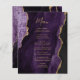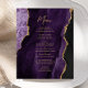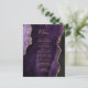 Este elegante cardápio moderno de casamento apresenta uma cor d'água púrpura e borda agitada com brilho de ouro falso. O texto personalizável combina o script de escrita manual dourada e as fontes de impressão em papel. O verso apresenta um design de agate roxo e dourado correspondente.