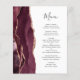 A borda esquerda deste elegante cardápio moderno de casamento mostra uma cor vermelha-de-água borrifada, aparada com uma falsa rosa dourada. O texto personalizável combina o script de escrita manual de cinzas de carvão e as fontes de impressão em um fundo branco. O lado inverso apresenta um design de burgundy e ouro-rosa.
