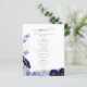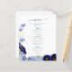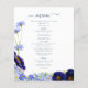 Linda mão de artista pintada de flores silvestres e folhagem de cor d'água em azul-esbranquiçado, azul-de-cornflor, marinho, roxo e verde, ideal para um único primavera ou dia de verão do cardápio do casamento. A escrita elegante da tipografia moderna, em azul marinho, complementa a trabalho de arte impressionante do bô, que inclui flores de milho, papoila, cosmos, esquecem-me nots e uma folhagem delicada. O cardápio de casamento da Boêmia Chic é perfeito para um prado de primavera, casamento de jardim de verão. Arte original da artista Catherine Sweetman