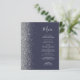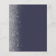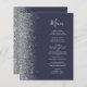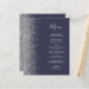 A borda esquerda deste elegante menu de casamento moderno apresenta uma borda cintilante de prata. O texto personalizável combina o script de escrita manual de cinzas prateadas e as fontes em um fundo azul escuro. O verso apresenta um design azul e prateado correspondentes.