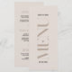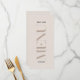 Este Menu Casamento em cores beges neutras será excelente para o casamento moderno. Apresenta letras em negrito no lado frontal da placa. O menu é dobrado e tem uma lista editável de pratos no verso. Você pode personalizar este menu com os nomes e a data do evento. Você também pode alterar a cor do plano de fundo, as fontes e as cores da fonte, se necessário, basta clicar em "Personalizar mais".