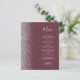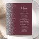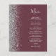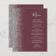 A borda esquerda deste elegante menu de casamento moderno apresenta uma borda cintilante de prata. O texto personalizável combina o script de escrita manual de cinzas prateadas e as fontes em um fundo burgundy escuro. O lado inverso apresenta uma burgundy e uma design prateada correspondentes.