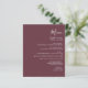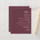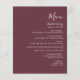 Este simples cardápio moderno de casamento mostra um texto branco sobre um fundo burguês escuro. A palavra "Menu" aparece na caligrafia na moda. Adicione o nome do casal e a data do casamento em script e itálico, juntamente com os detalhes do menu na fonte sans serif. O lado inverso é uma sombra de burgundy sólida.